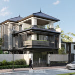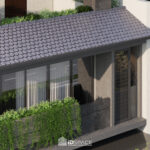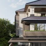 Công trình được tạo hình với bố cục vững chãi, hệ mái dốc nhẹ gợi nhắc kiến trúc truyền thống Việt, được cách tân bằng những đường nét tinh gọn và mạch lạc. Tỷ lệ khối nhà được xử lý cân đối, kết hợp cùng những khoảng mở lớn giúp tối ưu ánh sáng tự nhiên và thông gió, mang lại cảm giác thông thoáng, gần gũi mà vẫn riêng tư, ấm cúng.